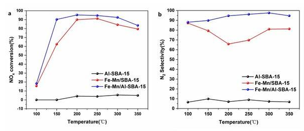 圖2. Fe-Mn/SBA-15催化劑和Fe-Mn/Al-SBA-15催化劑的NH3-SCR脫硝活性結(jié)果. a NOx轉(zhuǎn)化率.b N2選擇性