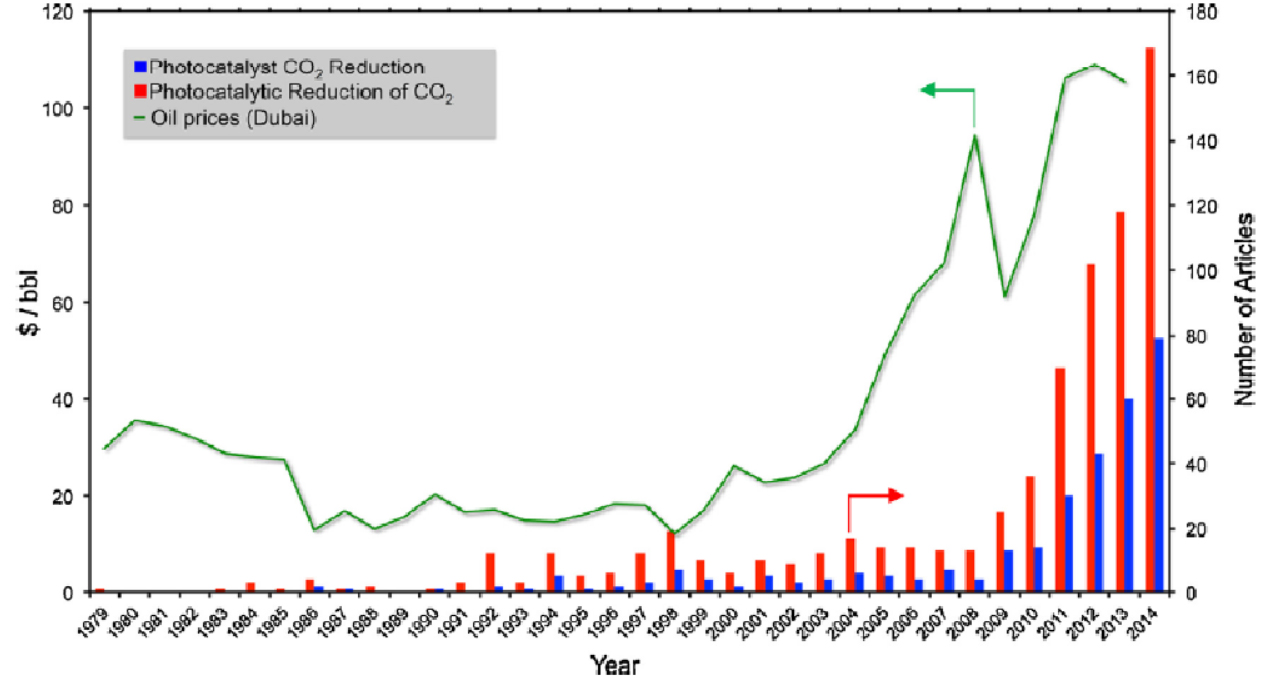 光催化還原CO2的現(xiàn)象最早發(fā)現(xiàn)于上世紀(jì)八十年代,隨后由于石油危機(jī)吸引了一些研究者的關(guān)注,并在此方向做出了鋪墊性工作。雖然在上世紀(jì)末因為能源問題得到一定緩解該方向慢慢冷卻下來,不過最近十年鑒于環(huán)境和能源問題日益突顯,光催化CO2還原又重新受到重視起來,研究熱度急劇增加,呈現(xiàn)穩(wěn)步上升趨勢。