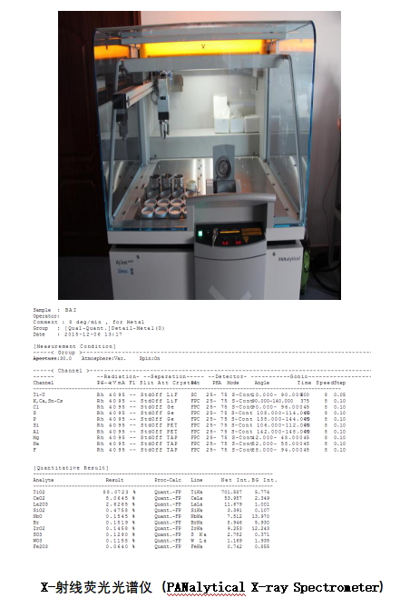 X射線熒光光譜儀,能分析F(9)~U(92)之間所有元素。無(wú)標(biāo)半定量方法可以對(duì)各種形狀樣品定性分析,并能給出半定量結(jié)果,結(jié)果準(zhǔn)確度對(duì)某些樣品可以接近定量水平,分析時(shí)間短??蓽y(cè)試催化劑中活性物質(zhì)的成分,把控產(chǎn)品質(zhì)量;也可以測(cè)試煙塵成分或者堵塞灰成分,分析失活原理;也可客戶來(lái)樣測(cè)試分析。